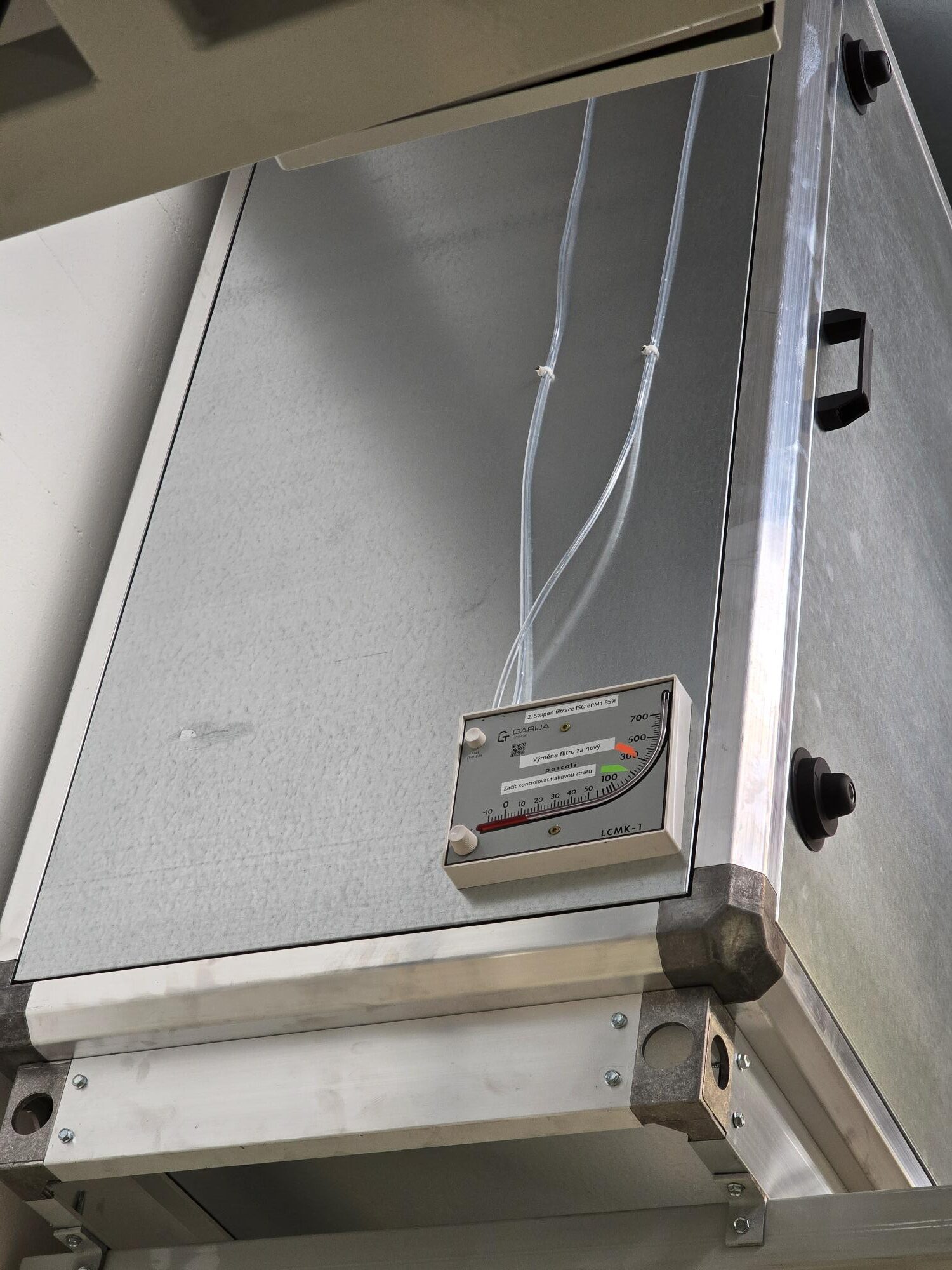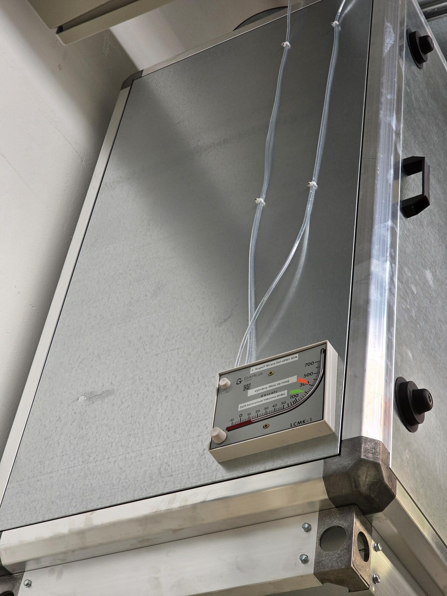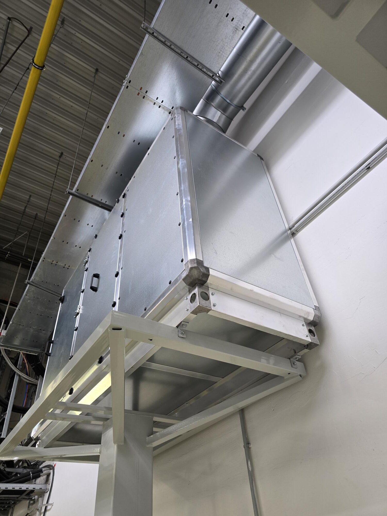 Přívodní distribuční elementy (vířivé anemostaty) byly osazeny do stropu výrobní kabiny, aby bylo zajištěno rovnoměrné rozptýlení proudícího vzduchu. Větrací jednotka byla umístěna na střeše kabiny a napojena na rozvod pomocí flexibilního potrubí. Součástí systému je i manometr pro kontrolu zanesení filtračních prvků.