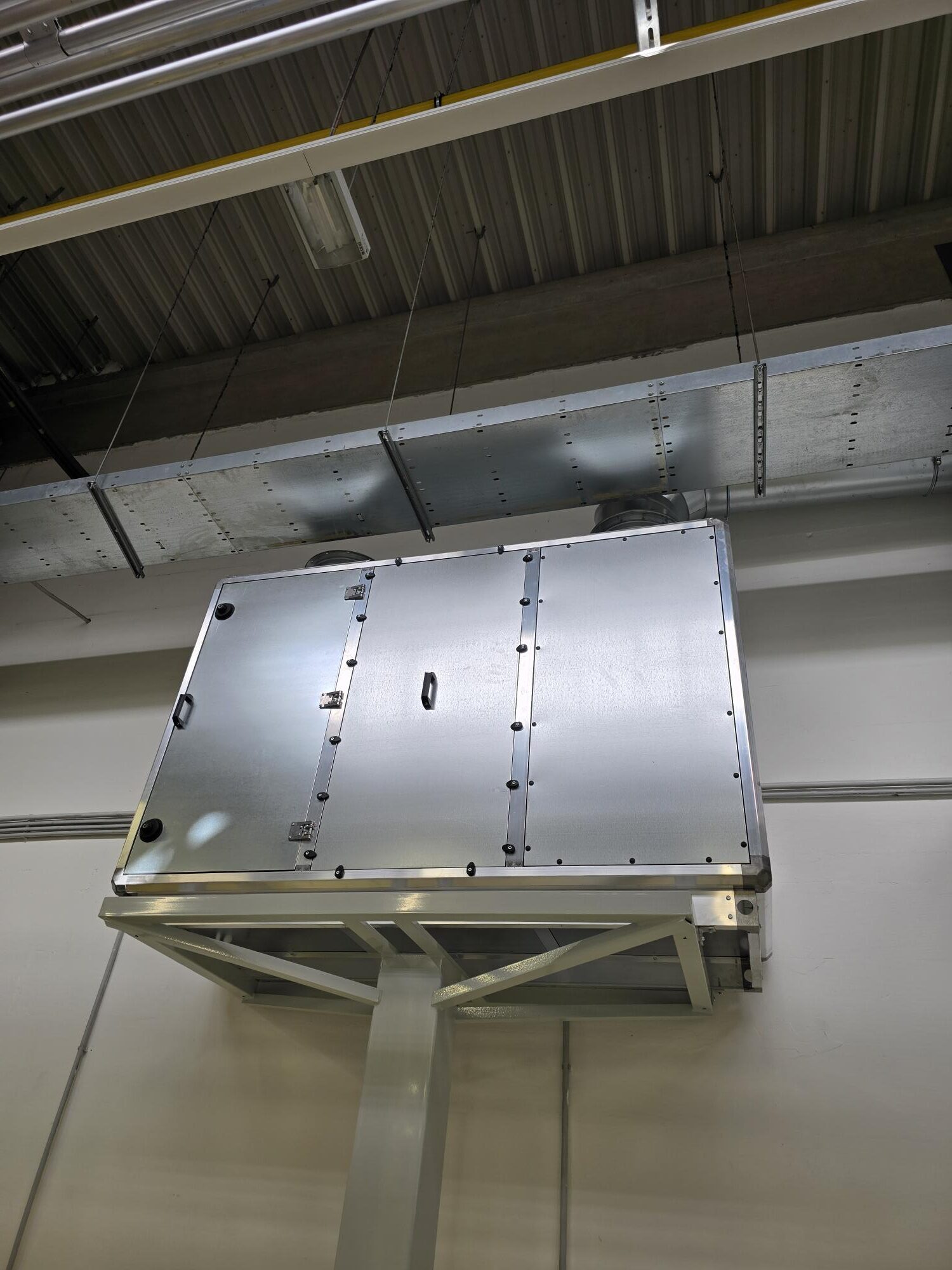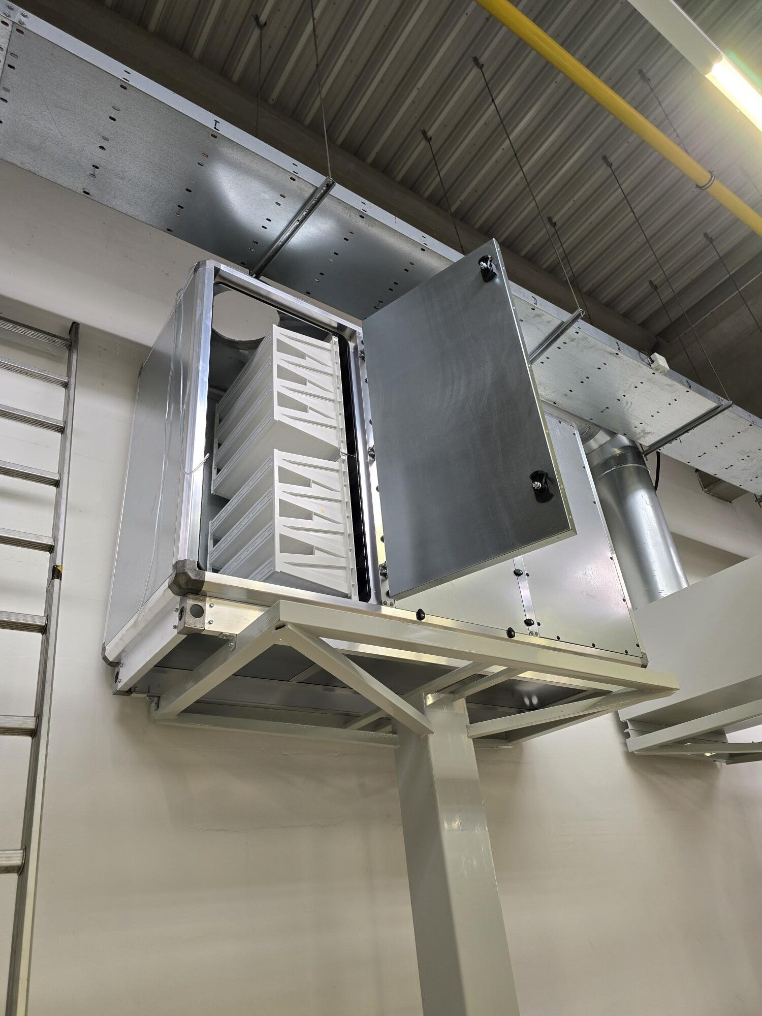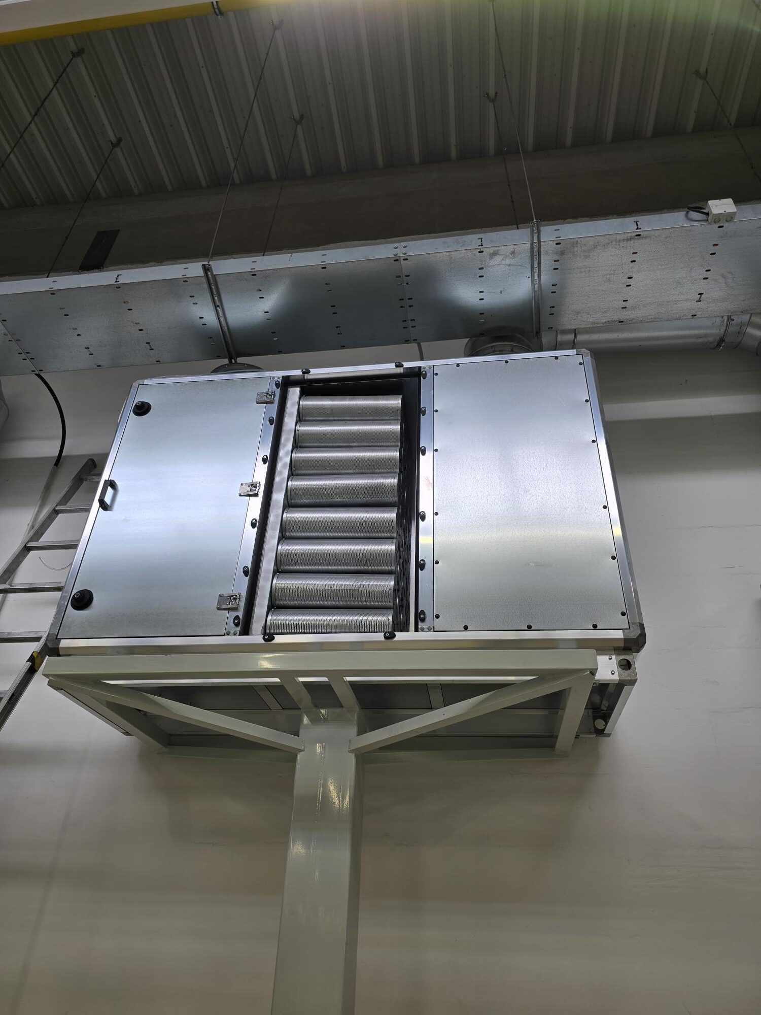 Přívodní distribuční elementy (vířivé anemostaty) byly osazeny do stropu výrobní kabiny, aby bylo zajištěno rovnoměrné rozptýlení proudícího vzduchu. Větrací jednotka byla umístěna na střeše kabiny a napojena na rozvod pomocí flexibilního potrubí. Součástí systému je i manometr pro kontrolu zanesení filtračních prvků.
