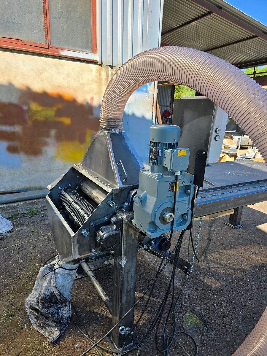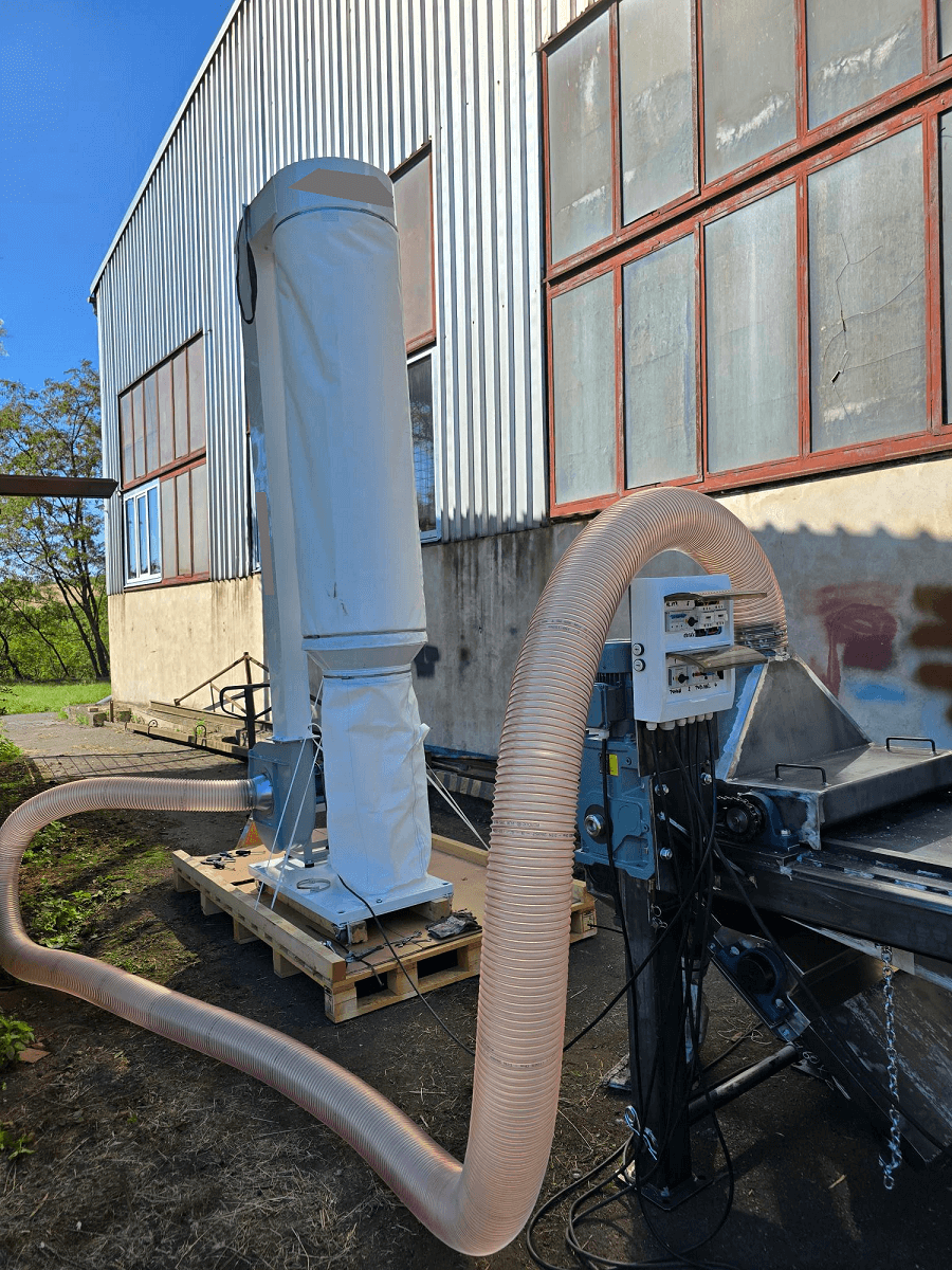 Při recyklaci a drcení fotovoltaických panelů vzniká velké množství jemného prachu se skelnými vlákny. Tento prach je vysoce abrazivní a při vysoké koncentraci představuje riziko jak pro obsluhu stroje, tak pro okolní technologie. Standardní provoz bez účinného odsávání by znamenal rychlé zanášení pracovního prostředí a zhoršení pracovních podmínek.